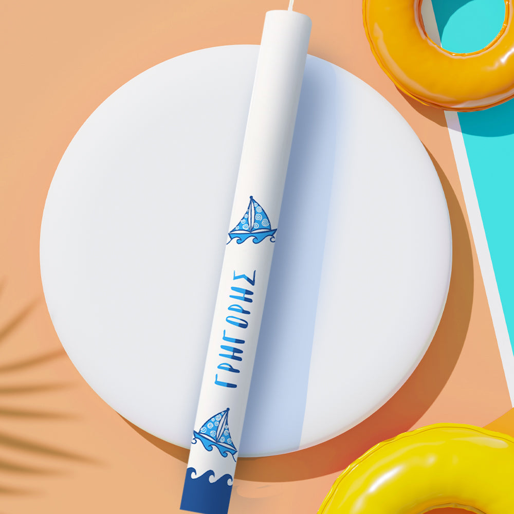 Λαμπάδα με σχέδιο καραβάκια. Δυνατότητα αλλαγής ονόματος.
