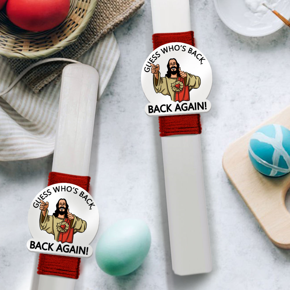 Λευκή Πασχαλινή λαμπάδα "GWB?"με κόκκινη κορδέλα και τοποθετημένο χιουμοριστικό σχέδιο.